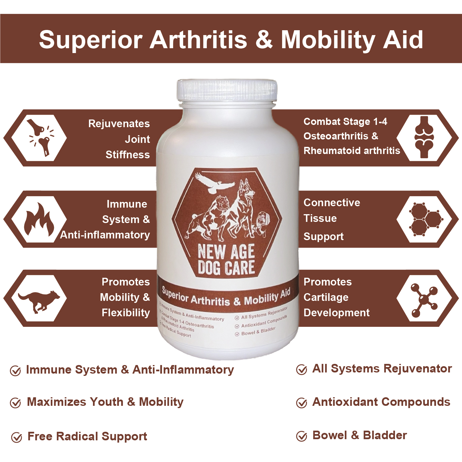 At New Age Dog Care, we’re not just improving dog health—we’re redefining it. Our advanced canine health solution is the result of over half a decade of research and development, designed to address a wide range of health challenges, including osteoarthritis, rheumatoid arthritis, immune system dysfunction, cognitive decline, cardiovascular issues, and more.